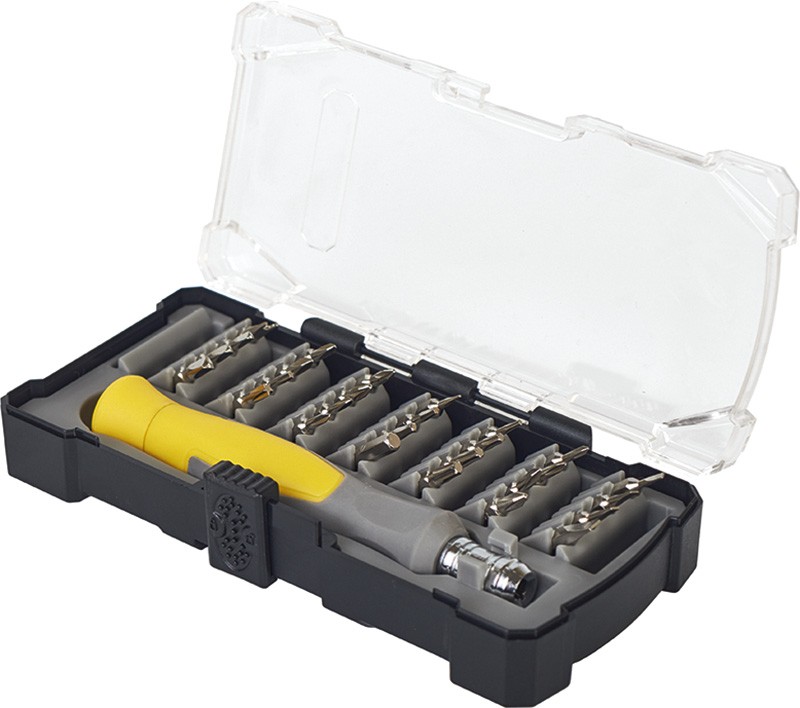 Типоразмеры отверток в наборе: SL1.5, SL2.5, SL3.0, SL4.0, PH000, PH00, PH0, PH1, T5, T8, T10, T15, H0.7, H1.5, H2.0, H4.0, PZ0, PZ1, Y2.0, Y2.3, Y2.5, Y3.0, *2.0, *3.0, U2.6, Δ2.0, Δ2.3, Δ3.0. Количество 29 шт.